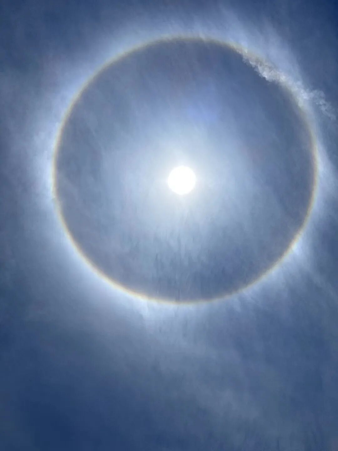 中午时分,太阳周边有一圈彩虹,好像给太阳戴上了“美瞳”,绚丽无比!不少网友在社交平台晒图记录下这壮观的一幕。